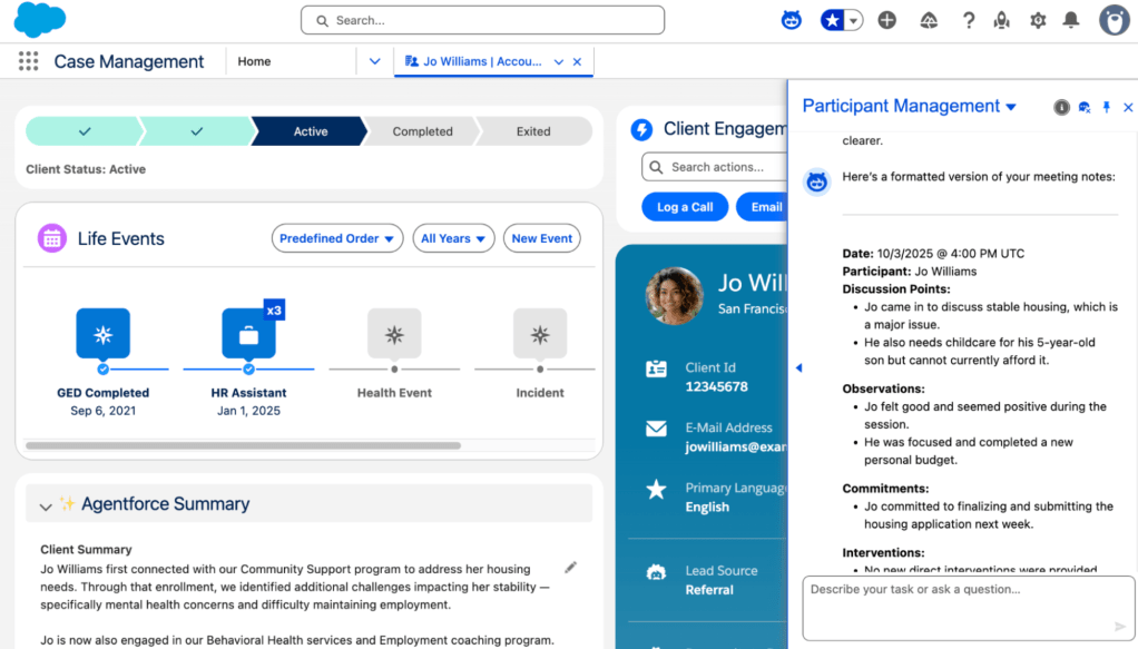 • Participant Management assists program and case managers by summarizing a client’s background and services. During a conversation with a client, the agent can work alongside a program or case manager to automatically create new goals, take notes, and flag referrals for needed services.