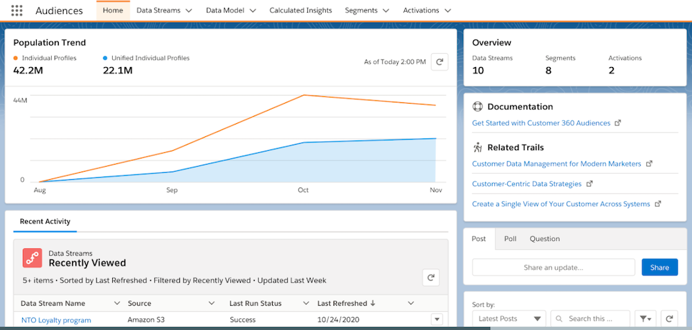 Customer 360 Audiences is our customer data platform (CDP) that enables marketers to capture and understand all customer data across their CRM and other data sources, like marketing tools, commerce systems, data warehouses and more, and activate that customer data for use in display advertising, email campaigns, SMS notifications, and any external engagement platform. With Customer 360 Audiences, companies can ingest and connect massive amounts of data (petabytes, to be exact) across siloed data sources. This unified data helps marketers build a single customer profile and create unique audience segments with the help of AI to drive more relevant engagement with customers on mobile apps, email, and call centers and more.