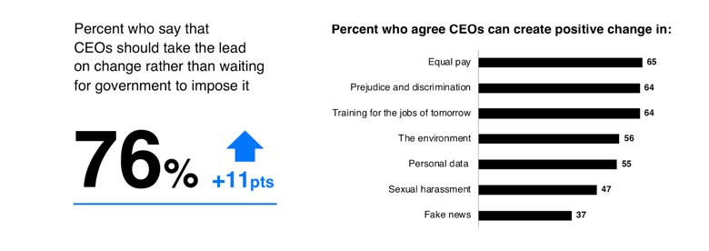 Less than half of those surveyed trust the very wealthy or government and religious leaders, but more than half (51 percent) trust CEOs. Additionally, 58 percent believe business is the most trusted institution, taking the lead role in global governance, and 76 percent believe that CEOs need to speak up and lead—up from 65 percent in 2019. They cited equal pay prejudice and discrimination; training for the jobs of tomorrow; the environment; personal data; sexual harassment; and fake news are areas where CEOs can lead.