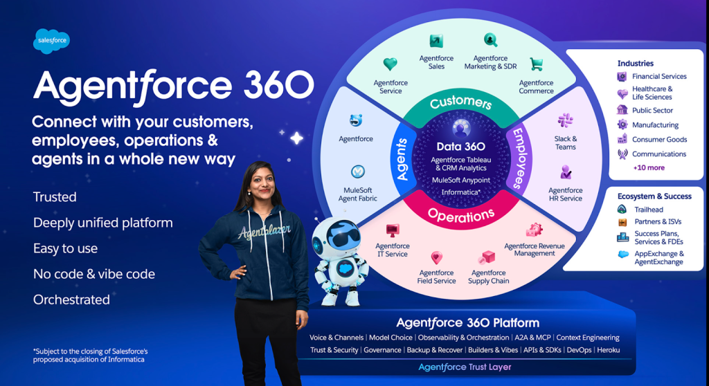 - Agentforce 360 Platform: The foundation for enterprise-grade AI agents, now featuring a new conversational builder, hybrid reasoning for greater control and accuracy, and voice capabilities.