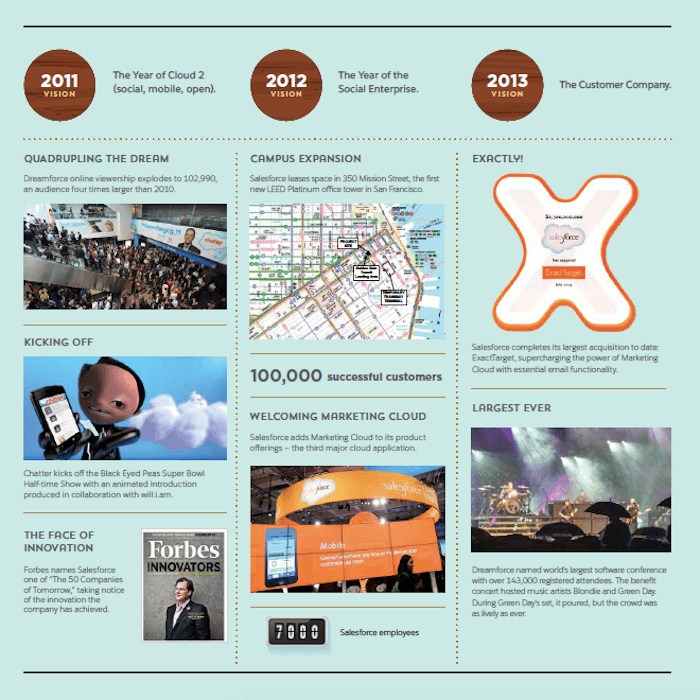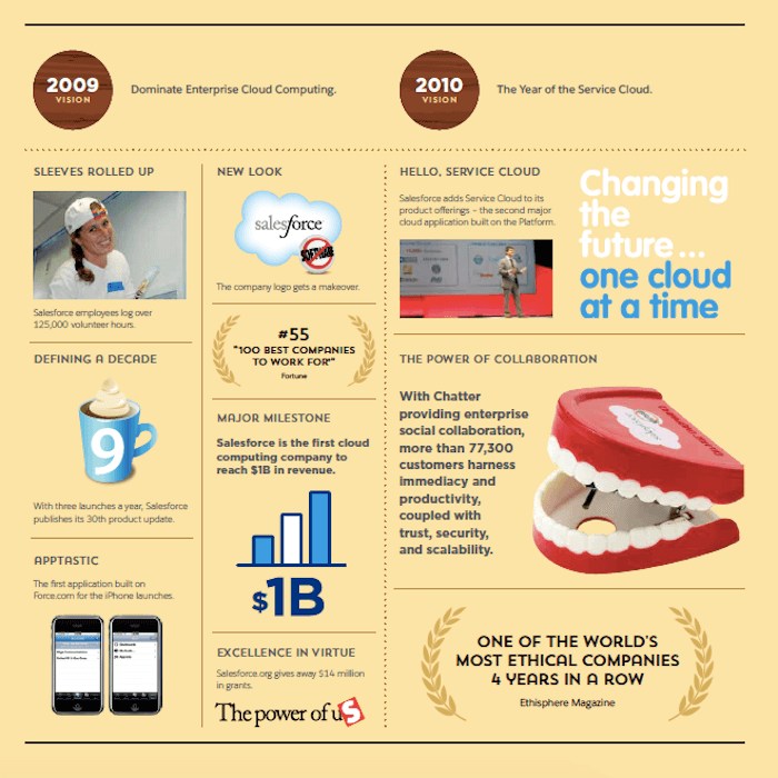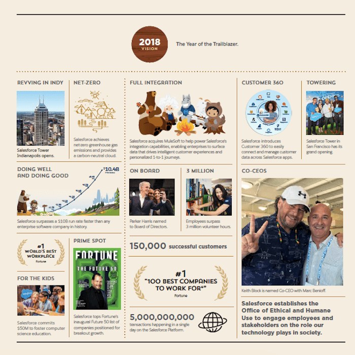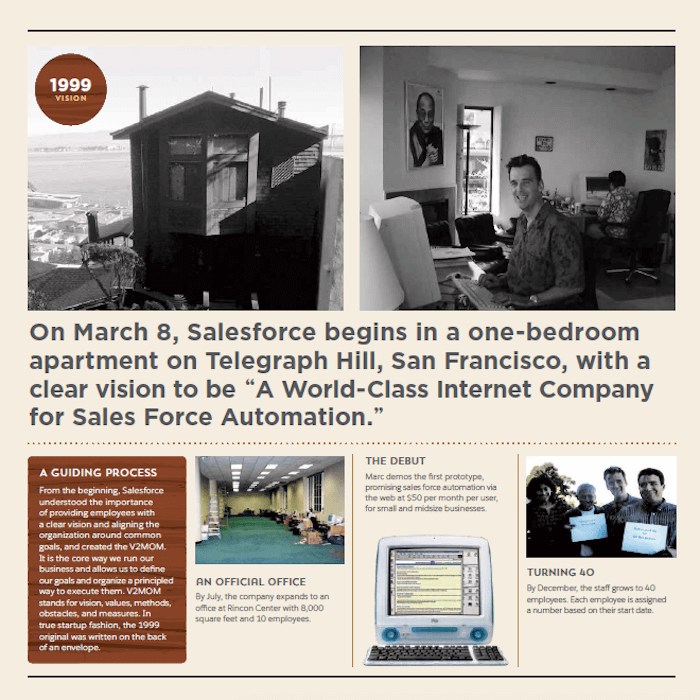 March 8 marks Salesforce’s 20th anniversary, and in addition to celebrating we are looking back at our historical moments and milestones. Below is a visual timeline that illustrates our company’s growth and record of doing well while doing good: