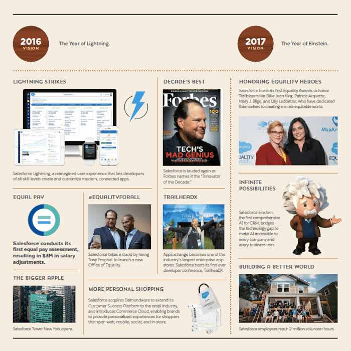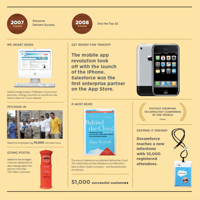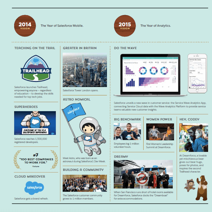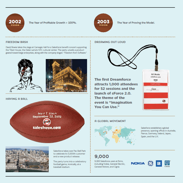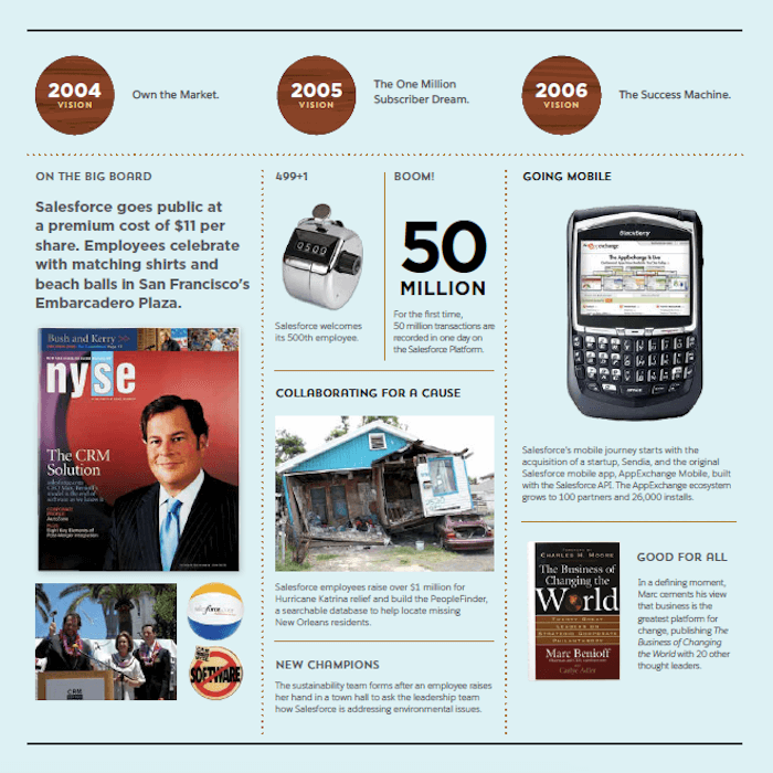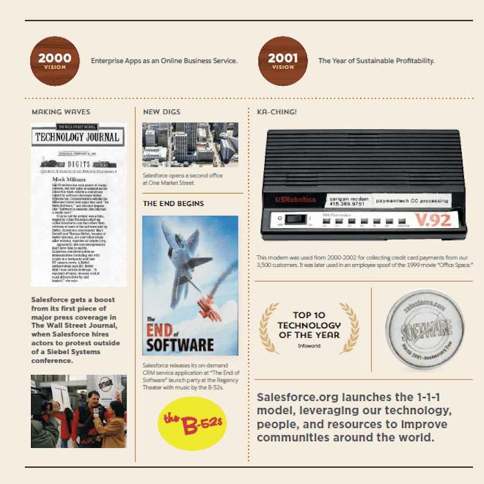 March 8 marks Salesforce’s 20th anniversary, and in addition to celebrating we are looking back at our historical moments and milestones. Below is a visual timeline that illustrates our company’s growth and record of doing well while doing good:
