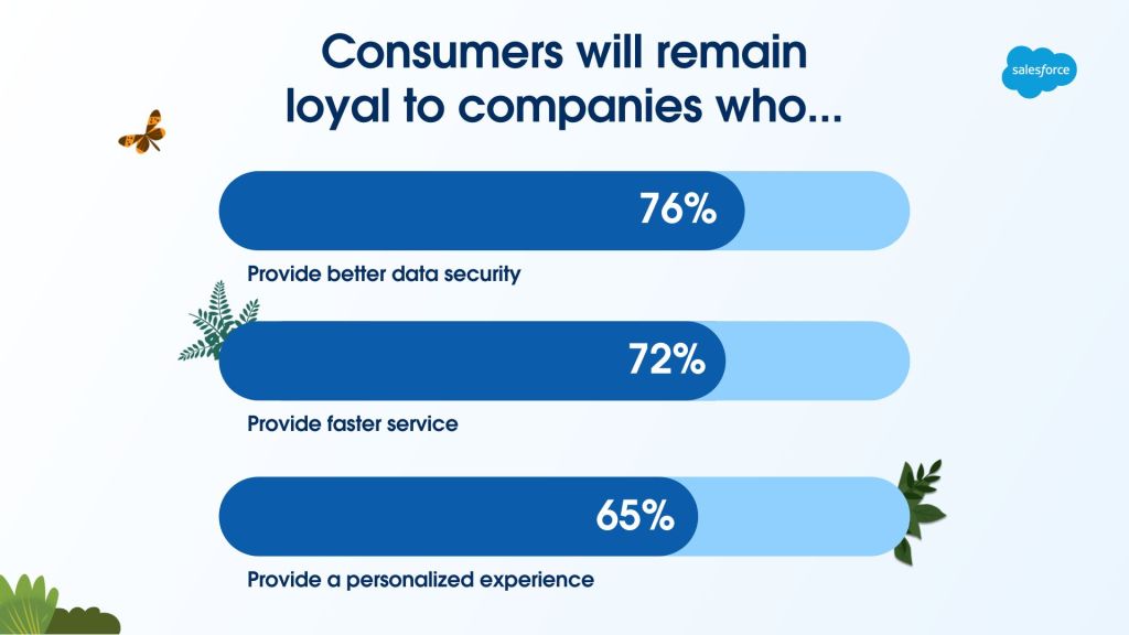 According to Salesforce data, 73% of customers expect companies to understand their unique needs and expectations, and 65% of consumers say they will remain loyal to companies that offer a more personalized experience. This can’t come at the expense of speed, either, as 72% of consumers say they will stay loyal to companies that deliver faster service. Savvy companies will tap into real-time data to offer these experiences across every touchpoint.