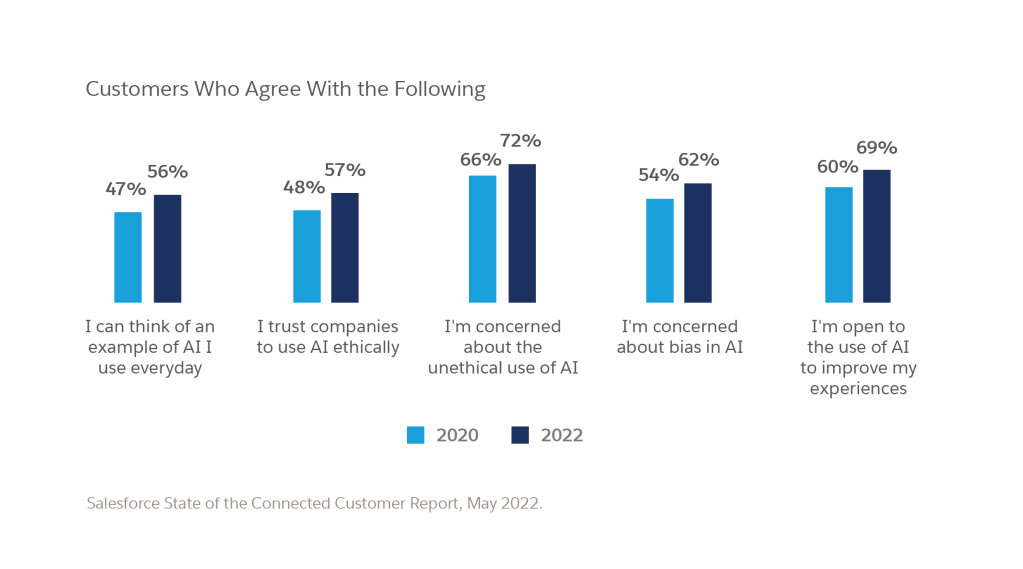 Seventy-two percent of customers are concerned about the unethical use of AI technologies, and only 57% of customers trust companies to use AI ethically. At the office, 83% of IT leaders believe businesses must work together to ensure generative AI is used ethically.