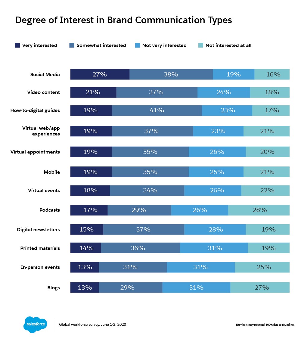 Social media is the clear winner of consumer attention, with 65% of consumers indicating interest. Other channels with notable interest include video content (such as webinars and on-demand sources like YouTube) and virtual experiences (like digital stores). On the other side of the spectrum, blogs and podcasts are less popular, with fewer than half of respondents claiming interest.