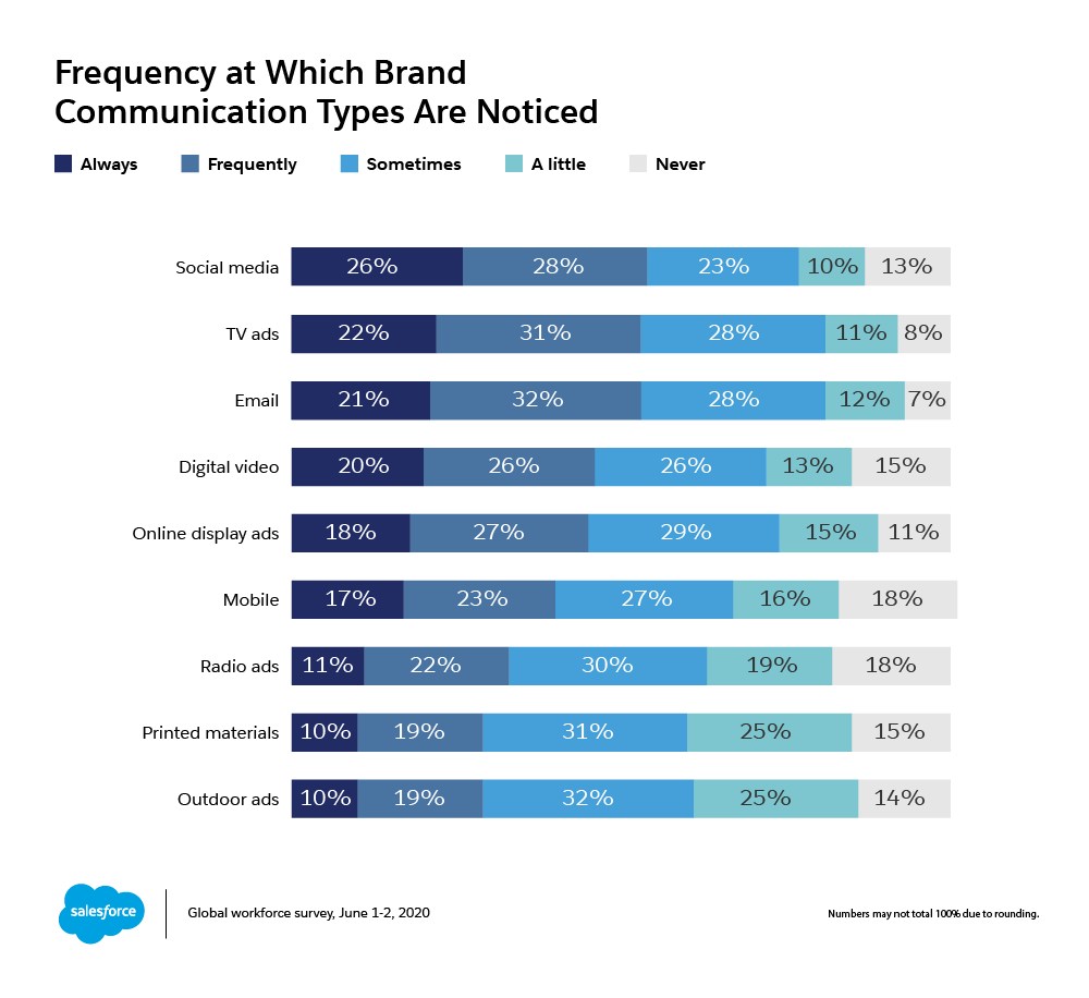 TV advertising, which has seen sluggish investment in recent years as media consumption habits changed — may warrant a renaissance given our increased time spent at home. 53% of consumers say they notice TV ads always or frequently.