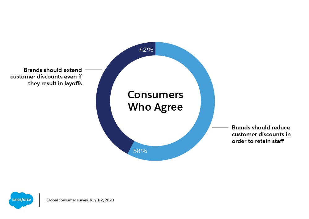 Despite their focus on discounts and offers, the majority of consumers are willing to forego deals if it means their fellow citizens retain their jobs. 58% of consumers say brands should reduce customer discounts in order to retain staff.