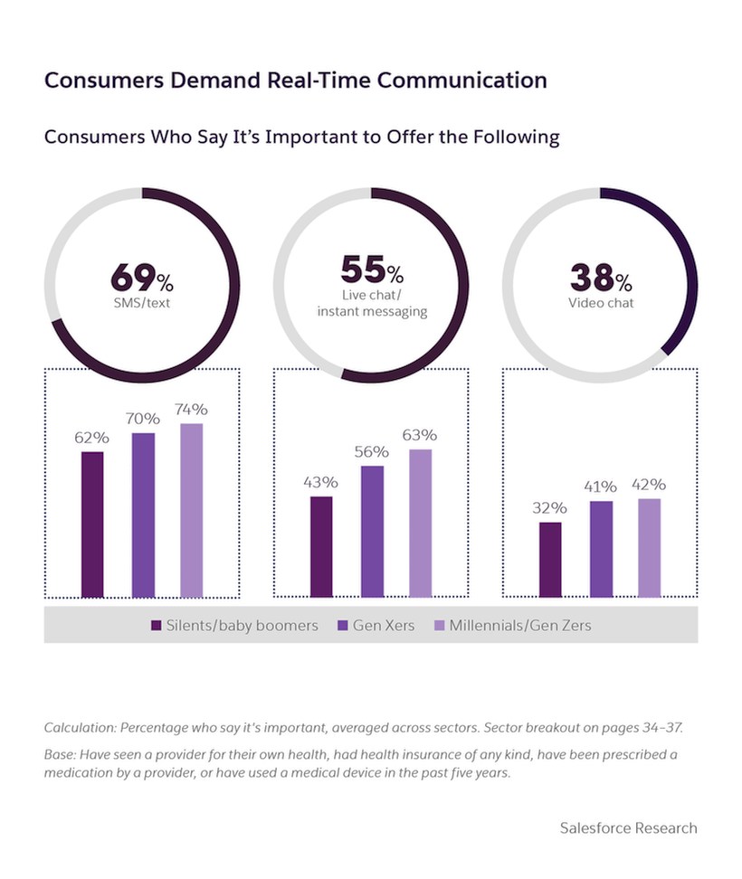 Sixty-eight percent of consumers now expect companies to engage with them in real time. Among healthcare consumers, millennials and Gen Zers have particularly strong demands for immediacy. These younger generations are more likely to value instant messaging, texting, and video chat — channels that provide instantaneous feedback or are commonly used on-the-go.