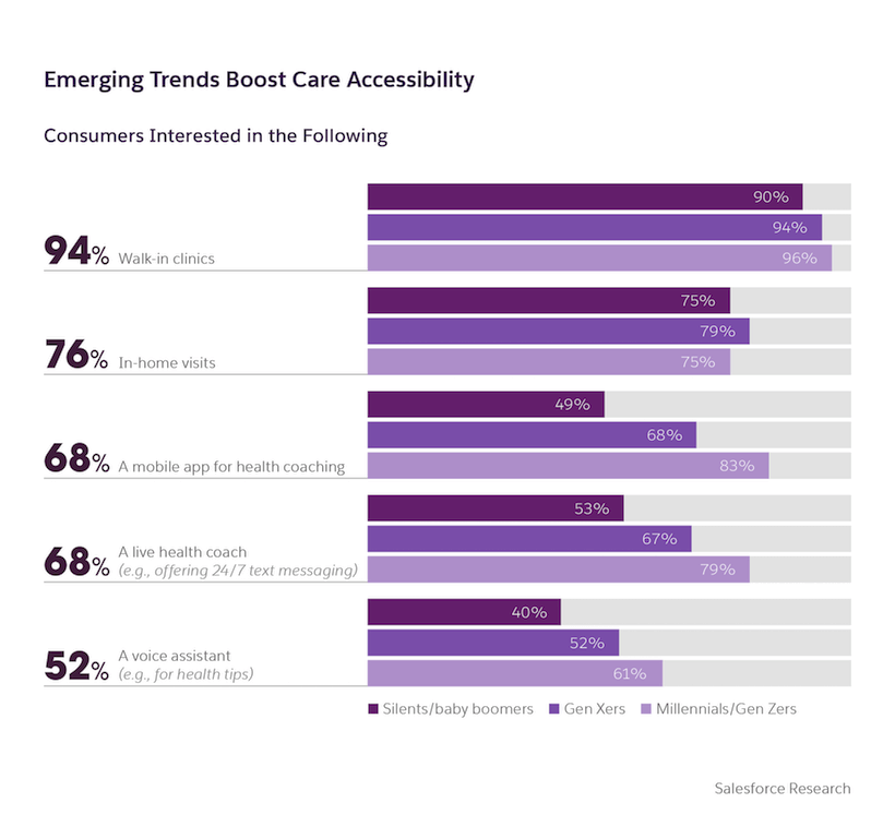 Between the complexity of personal life circumstances and of the healthcare and life sciences ecosystem, consumers are interested in reducing the barriers to care. Ninety-four percent of consumers are interested in walk-in clinics, and younger generations express strong interest in technology-based methods like mobile apps, texting with a health coach, and using a voice assistant.