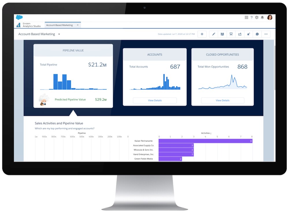 - Einstein Attribution: Delivers AI-based marketing attribution analysis in reports and dashboards to accurately assign revenue credit to multiple marketing touch points throughout the customer journey.