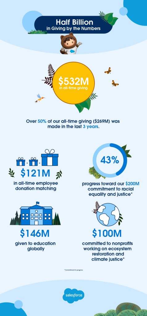 Salesforce has reached over half a billion dollars in all-time philanthropic giving — a total of $532 million in grants since its founding. Salesforce also surpassed $100 million in annual giving in the 2022 fiscal year — a first for the company.