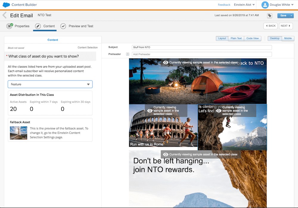 · Einstein Content Selection: Automatically recommends which visual assets to use throughout every part of an email, personalized to customers based on their preferences and behaviors. Marketing emails have different images and content that are placed strategically to get a customer to take action. Einstein Content Selection takes the guesswork out of what images to use and where to place them.