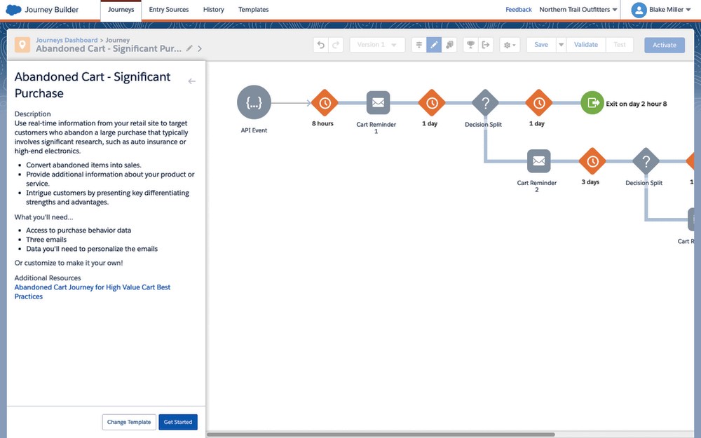 - Journey Templates: Marketers can now create journey templates to share across the organization to quickly build and deploy campaigns. For example, a marketer whose company has similar events taking place throughout the country can use the same journey path and content, but apply it to a different audience at a different time. And with Einstein, marketers will be able to create smarter journey templates with recommended content, text or journey paths as campaigns are deployed.