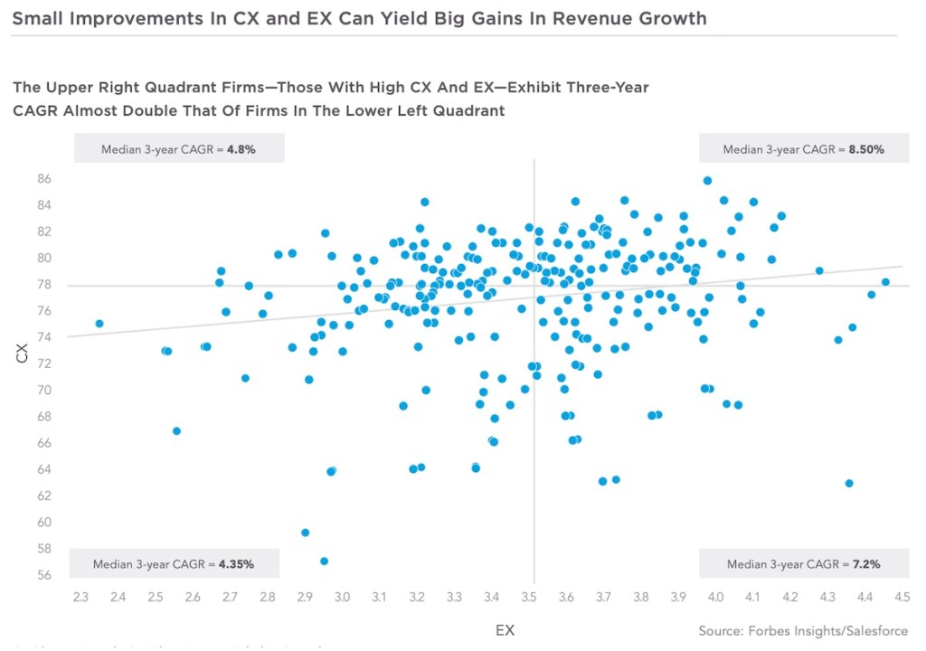 • Breaking silos between employee experience and customer experience can lead to a massive opportunity for revenue growth of up to 50% or more.