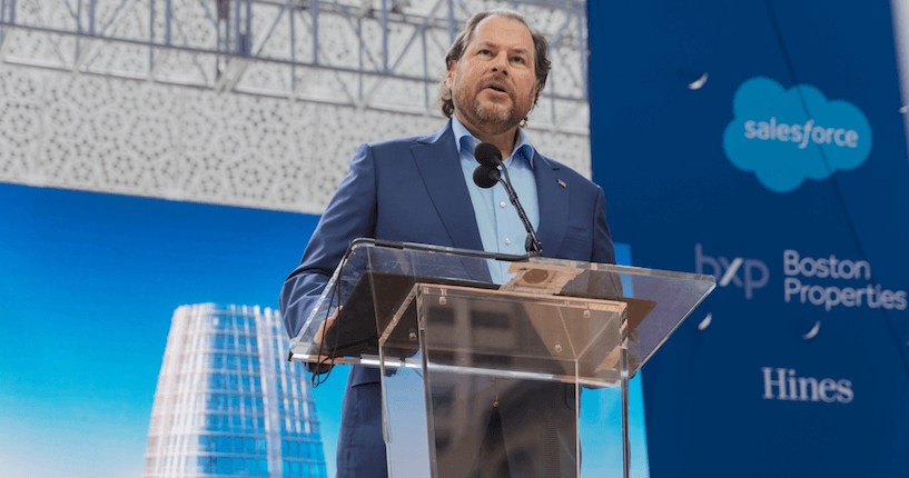 “We see a city undergoing great change, but also facing urgent challenges. Great progress—neighborhoods and businesses that are booming—but also communities and people that feel forgotten. We see extraordinary wealth, a community with over 70 billionaires, but also grinding poverty in the shadow of this building,” Benioff told the crowd of several hundred politicians and business and religious leaders at the base of the glass and steel tower on a chilly, misty morning.