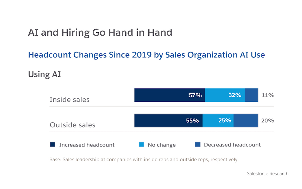 AI adoption by sales teams has jumped by 76% since 2018 (from 21% to 37%). Salespeople consider AI’s most significant impact to be improved understanding of customer needs — which speaks to the speed of change and importance of insight into customers’ evolving situations. Notably, AI isn’t displacing human talent in sales. Sales organizations that are using AI are more likely to be increasing headcount than organizations that are not using AI.