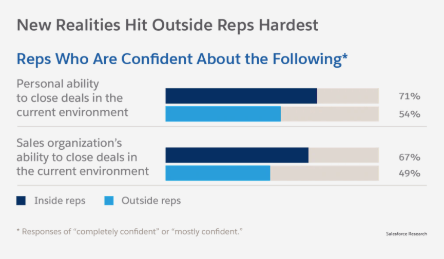 Selling during a public health and economic crisis isn’t easy for anyone, but it’s hitting field sales reps the hardest. Outside sales teams, typically reliant on in-person meetings, are now learning how to sell from home via call or video. Outside sales reps are less confident than their inside sales counterparts in their personal ability and their organization’s ability to close deals. Outside sales reps are also less likely to feel like their manager understands their day-to-day challenges, compared to inside sales reps.