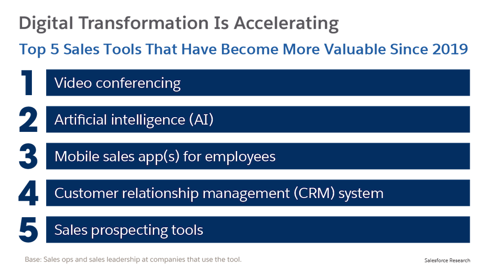 Seventy-seven percent of sales leaders say their digital transformation has accelerated since 2019. Video conferencing leads the roster of increasingly valuable sales tools — something that will come as no surprise in the midst of a pandemic. AI mobile sales apps, and CRM systems have also earned more prominent roles in sales toolkits – as sales operations seek to provide teams with both on-the-go and data-driven tools to do their jobs. Overall, 81% of respondents say sales technology needs have changed significantly since last year, and that they’re implementing changes faster than in 2019.