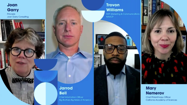 One panel conversation focused on the topic of Organizational Resilience: Embracing a Digital-First Future. The U.S.-specific panel was moderated by Joan Garry, author and founder of the Nonprofit Leadership Lab, and featured Jarrod Bell from Big Brothers Big Sisters, Trovon Williams from the NAACP, and Mary Nemerov from the California Academy of Sciences.