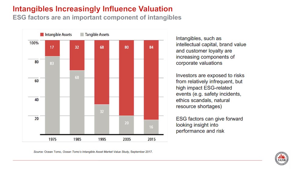 Investors too are looking beyond tangible assets to determine a company’s success. The Sustainability Accounting Standards Board (SASB) finds intangibles such as intellectual capital, brand loyalty, and customer loyalty today comprise the majority of corporate valuations, a complete reversal from the 1970’s, when many of today’s corporate leaders were in business school. Environmental, social and governance (ESG) performance enhance and protect intangible value.