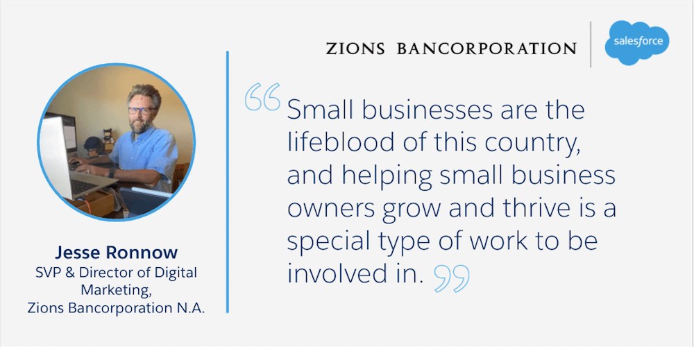 Salesforce sat down with Zions Bancorporation’s SVP and Director of Digital Marketing, Jesse Ronnow, to discuss how it has responded to COVID-19, including leveraging Salesforce technology to support its bankers, customers and communities virtually: