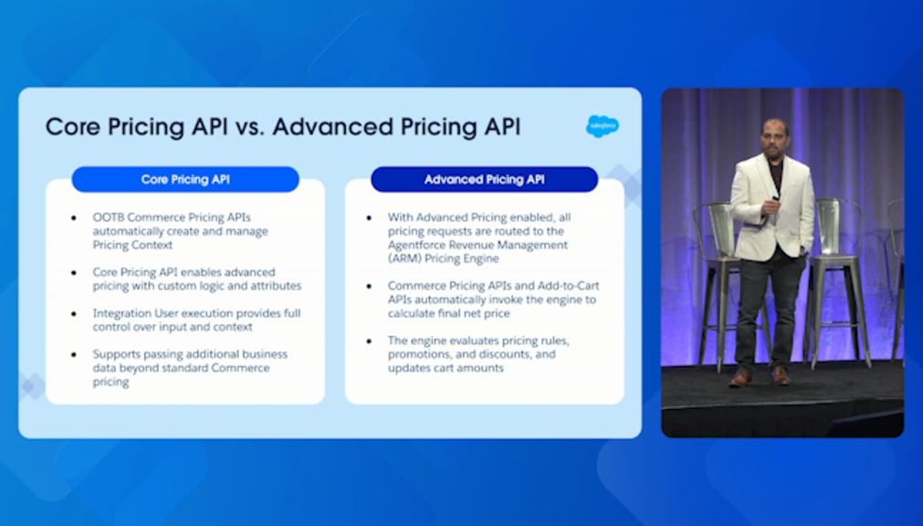 Build headless commerce using Revenue Cloud Advanced and Commerce Advanced Pricing Setup to centralize account-based pricing, subscription renewals, and proration through pricing procedures.