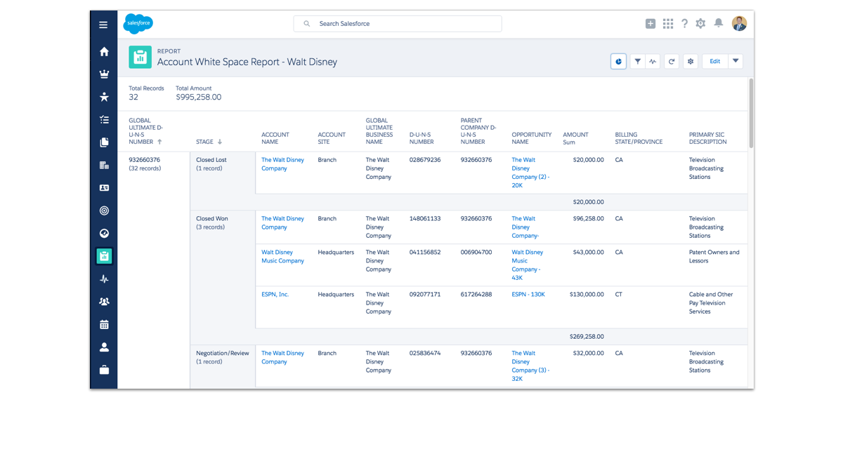 Use strategic whitespace analysis to run revenue roll-up reports and uncover opportunities in different branches, divisions or business units.