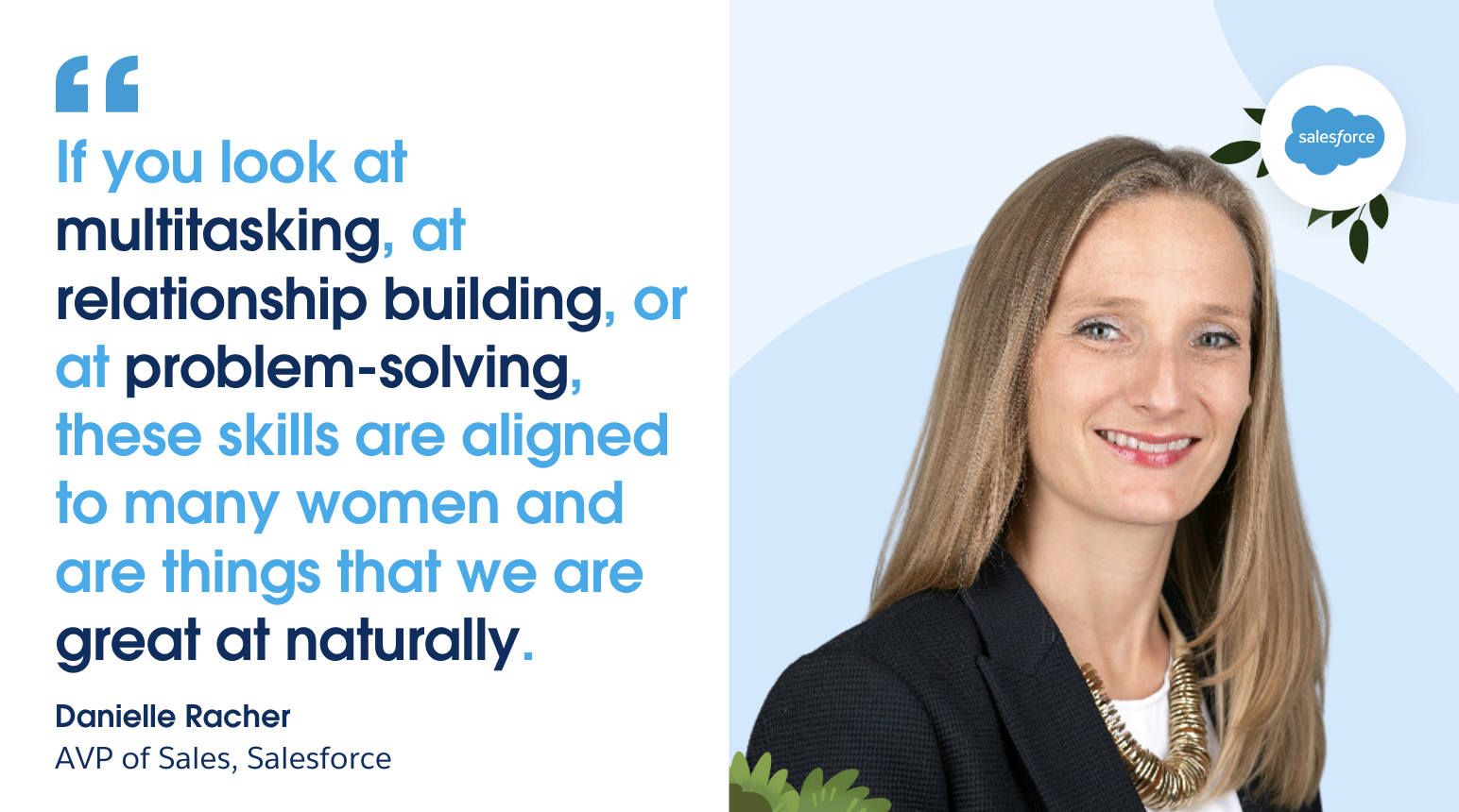“If you look at multitasking, at relationship building, or at problem-solving, these skills are aligned to many women and are things that we are great at naturally. So, you’re not trying to make yourself into something you’re not. You’re growing and developing the things you’re already good at. So, it’s a perfect career path for women and I think it’s a really great place to be.” – Danielle Racher, AVP of Sales at Salesforce.