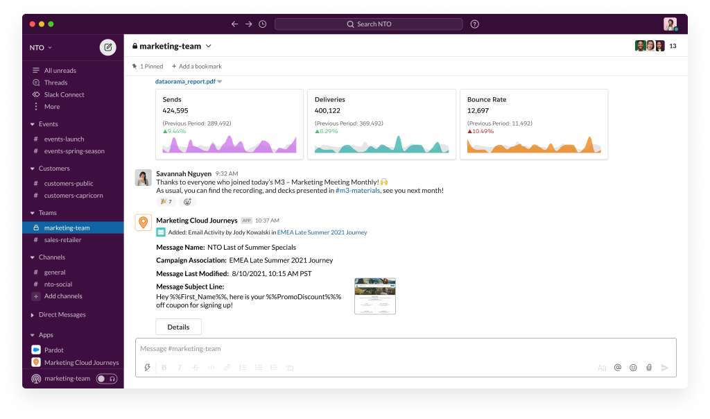 • Intelligent, AI-driven insights from Marketing Cloud and Datorama – such as engagement being lower than expected – are shared directly in Slack, ensuring teams can take action fast to ensure campaigns stay on track.