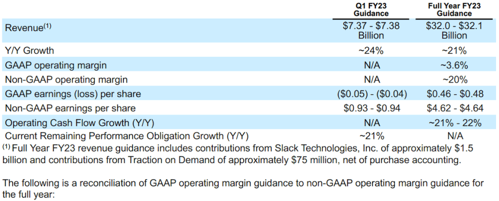 “We had another phenomenal quarter and full-year of financial results,” said Marc Benioff, Chair and Co-CEO of Salesforce. “As we continue to see tremendous demand from customers, we’re raising our FY23 revenue guidance to $32.1 billion at the high-end of range, with non-GAAP operating margin of 20%, and operating cash flow growth of 22% year-over-year.”