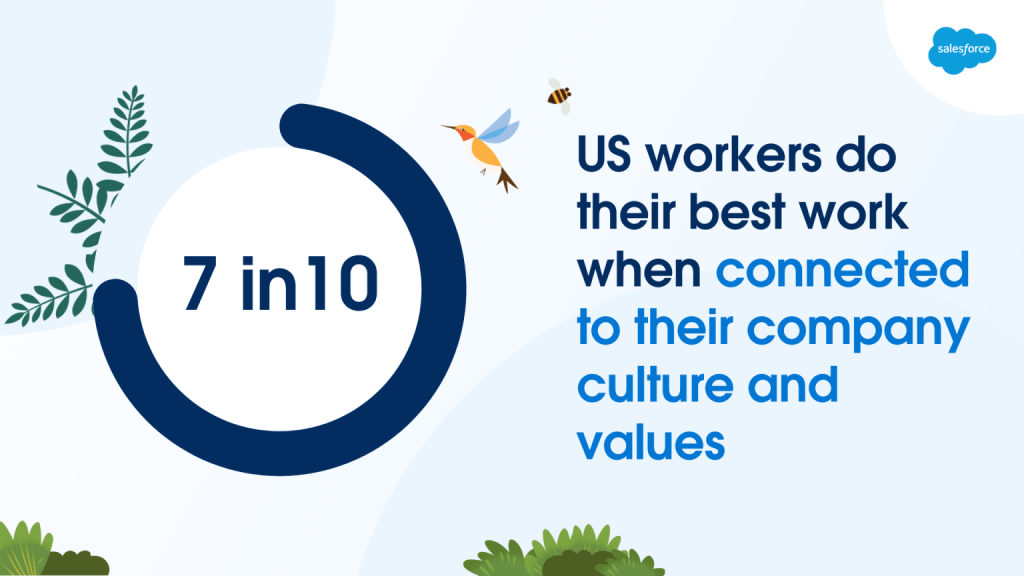 Team connection is still the #1 ask from our employees. And new Salesforce research found 7 in 10 U.S. workers feel motivated to do their best work when they feel connected to their company culture and values.