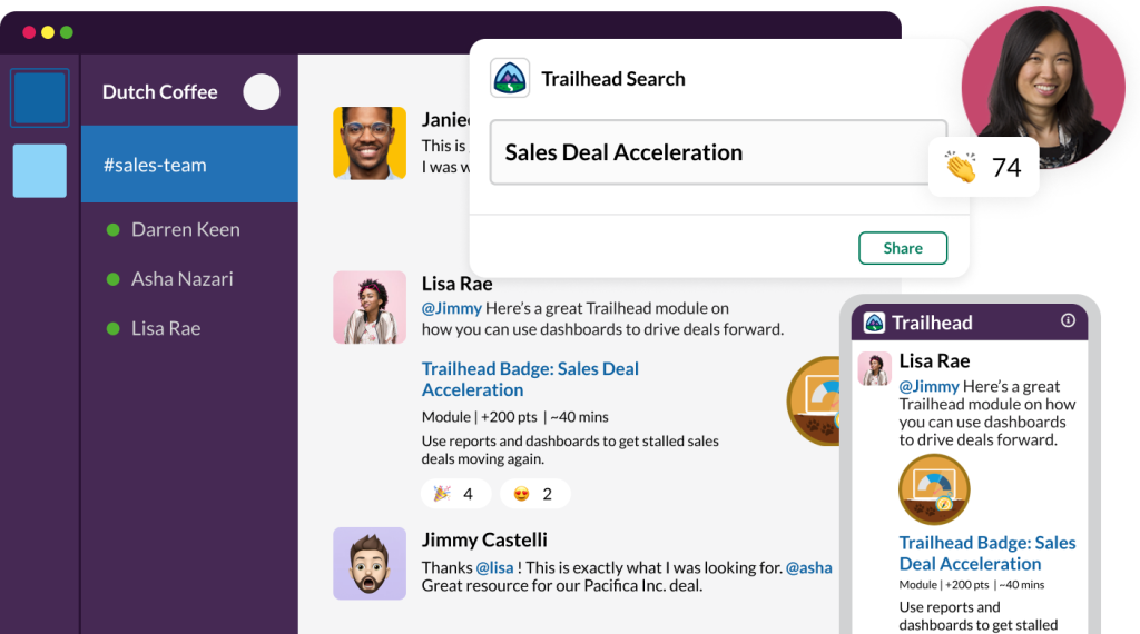 Now, with Trailhead for Slack, companies can drive enablement, onboarding, and reskilling in new channels for on-the-job learning from anywhere. With a simple Slack slash command, employees can discover and share relevant Trailhead content, accelerate their learning with reminders and recommendations powered by Einstein, and track progress with favorited and assigned content — all without ever leaving their digital HQ.