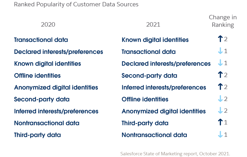 As technology providers and governments put increased restrictions — or even outright bans — on the cookies that digital marketers have relied upon, the relative value of those data sources is evolving. Known digital identities, second-party data, and inferred interests/preferences saw the biggest jumps in popularity since 2020, whereas offline identities and anonymized digital identities saw the biggest declines.