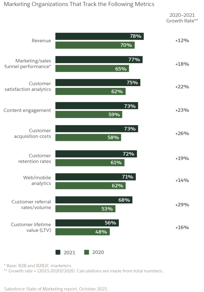 78% of marketers state they have changed or reprioritized metrics due to the pandemic. While marketing KPIs saw increased tracking across the board, customer referral rates, customer acquisition costs, and content engagement saw the biggest year-over-year jumps in adoption.